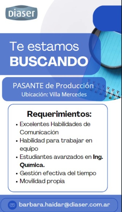DIASER se encuentra en la busqueda de estudiantes avanzados de Ing. Química para Pasante de Producción.